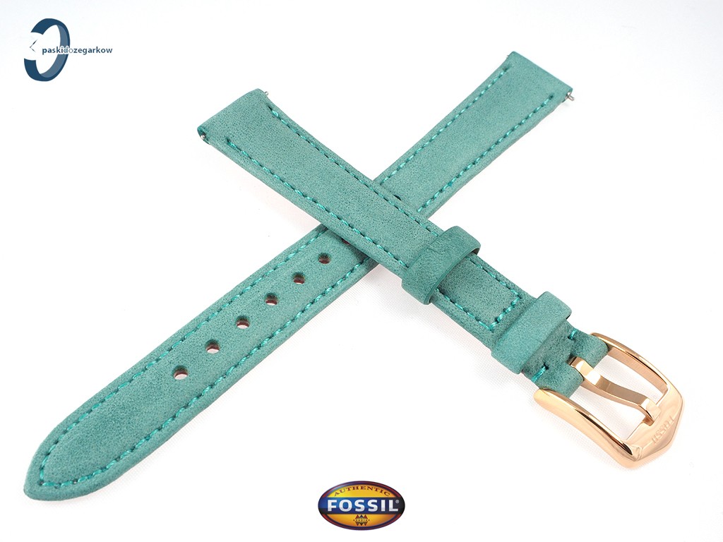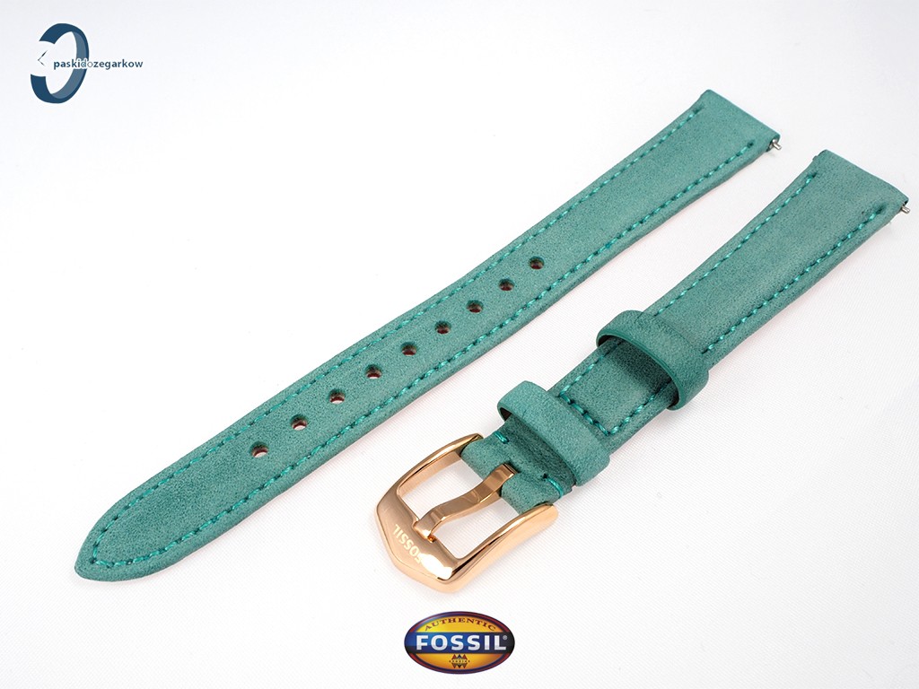 Oryginalny pasek do zegarka Fossil do modelu ES4149 skórzany, w kolorze turkusowym, gładki, przeszyty, matowy, sprzączka paska wykonana ze stali nierdzewnej w kolorze różowe złoto.