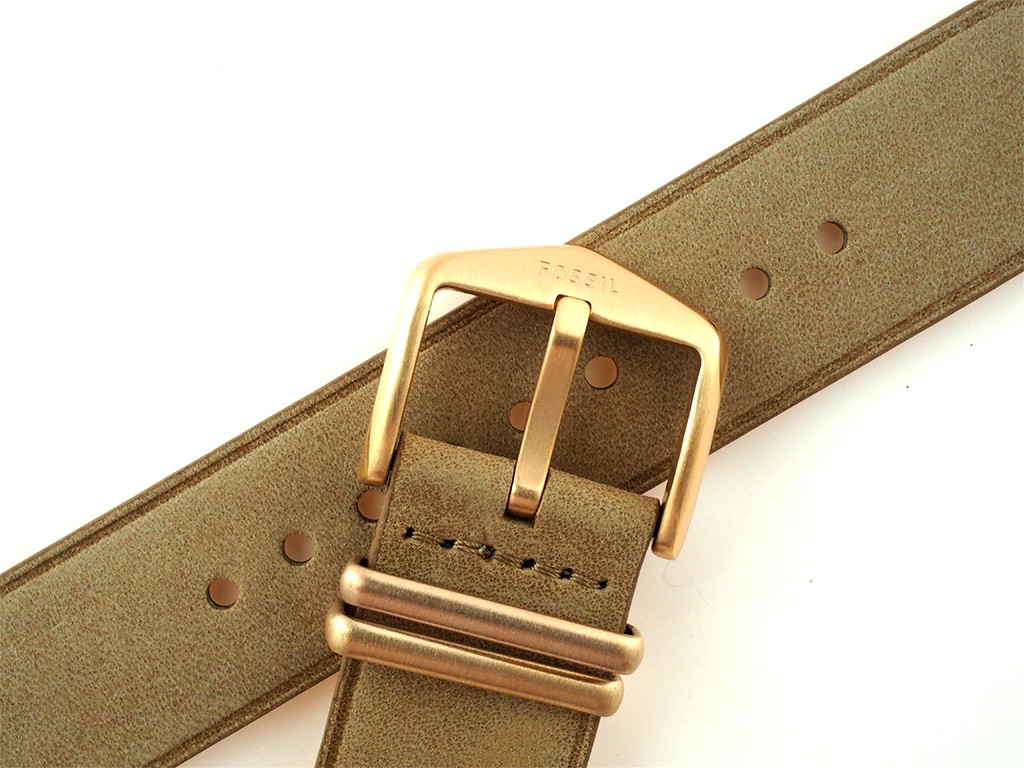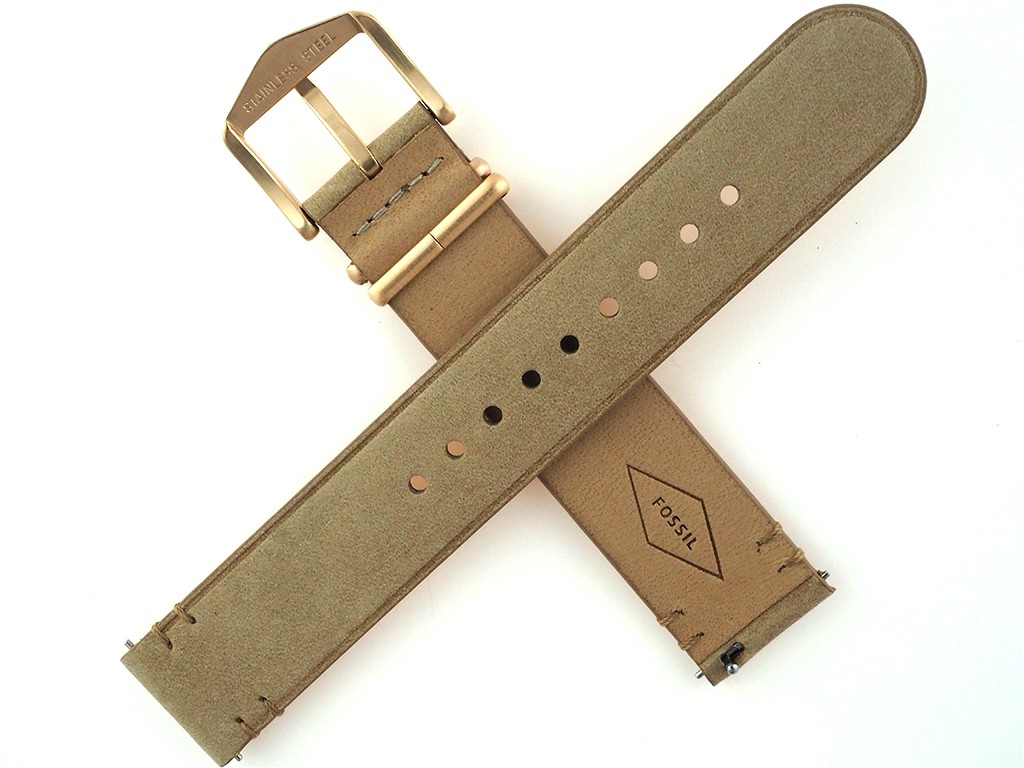 Pasek do zegarka wykonany jest ze skóry w kolorze beżowym, gładki, bez wypełnienia. Sprzączka oraz szlufki wykonane są ze stali nierdzewnej w kolorze różowego złota.