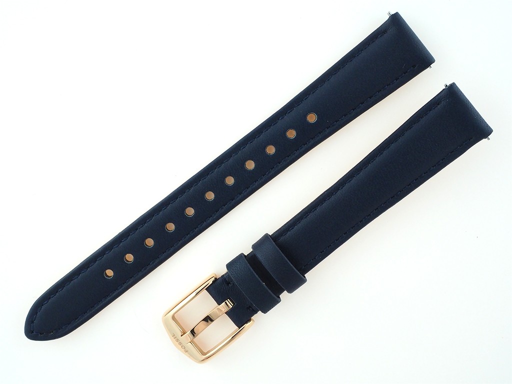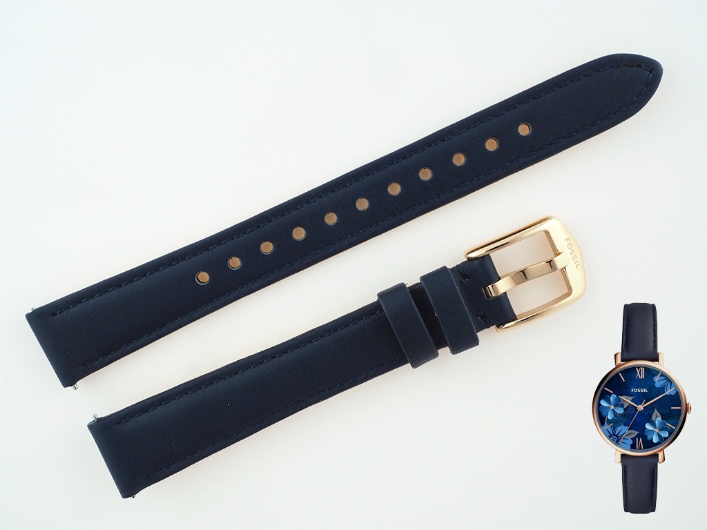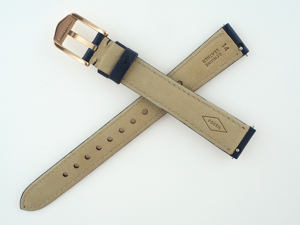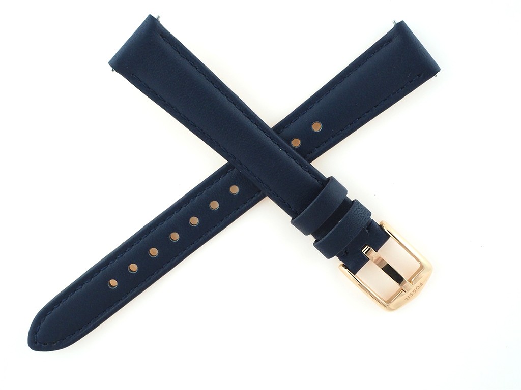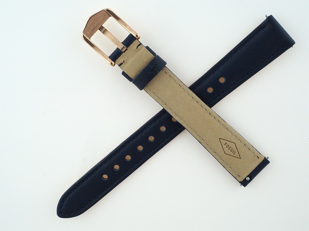 Oryginalny pasek do zegarka Fossil do modelu ES4673 skórzany, gładki, przeszyty, granatowy, sprzączka wykonana ze stali nierdzewnej w kolorze różowego złota, na sprzączce wybity napis Fossil.