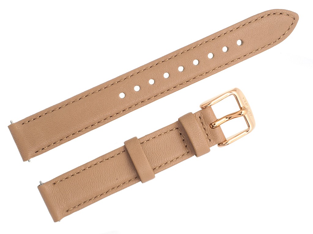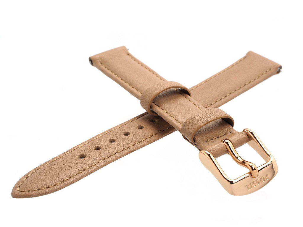 Oryginalny pasek do zegarka marki Fossil do modelu BQ1576, wykonany ze skóry naturalnej w kolorze jasny brąz, gładki, matowy, przeszyty, sprzączka wykonana ze stali nierdzewnej w kolorze różowego złota.