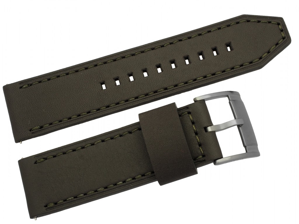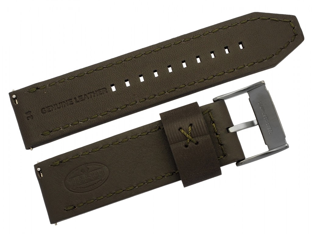 Oryginalny pasek do zegarka marki Fossil do modelu JR1419, wykonany ze skóry naturalnej w kolorze ciemnym zielonym wpadającym w szarość, bez wypełnienia, przeszyty zieloną nicią, gładki, sprzączka wykonana ze stali nierdzewnej w kolorze szarym.
