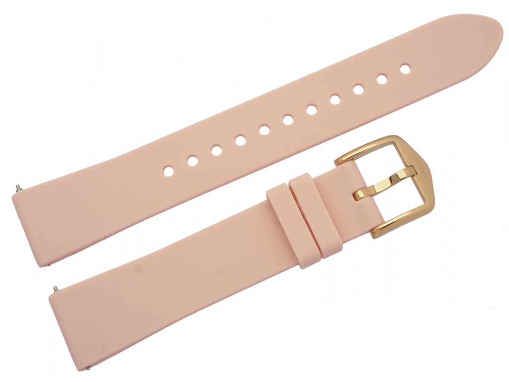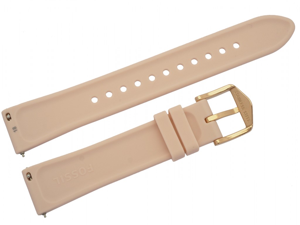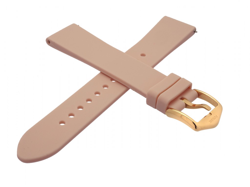 Pasek do zegarka wykonany jest z silikonu w kolorze różowym, gładki. Sprzączka wykonana są ze stali nierdzewnej w kolorze różowe złoto z napisem Fossil.