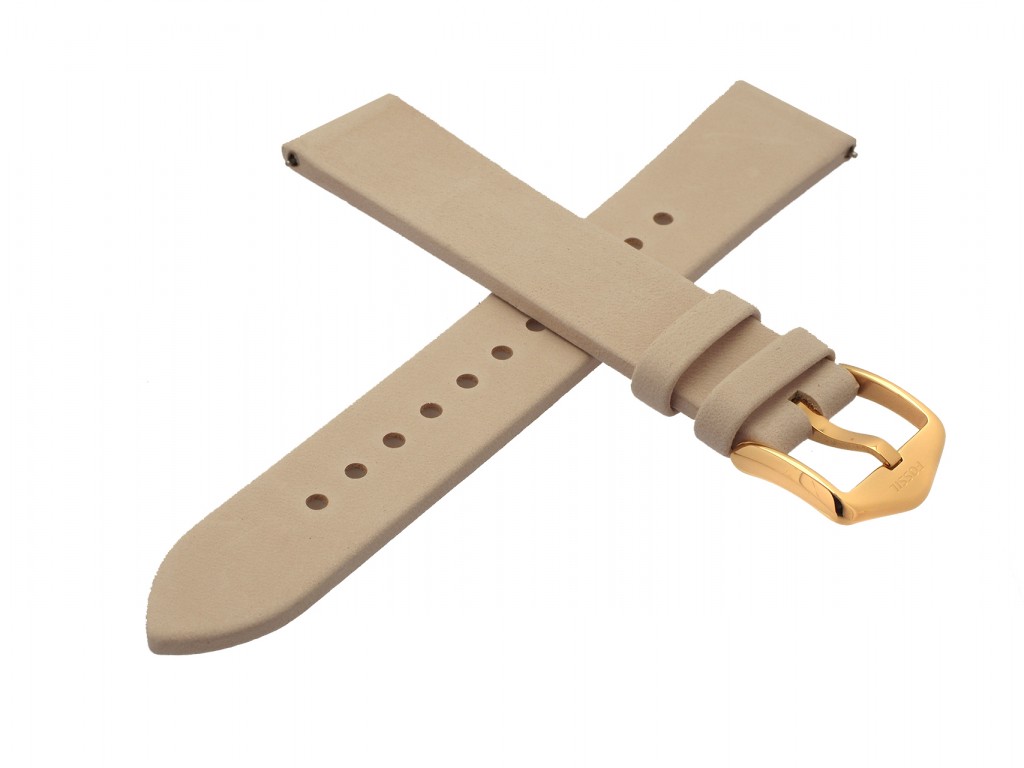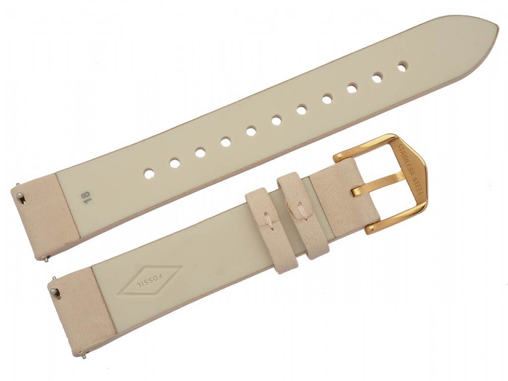 Pasek do zegarka wykonany jest ze skóry w kolorze różowym ( brudny róż), gładki. Sprzączka wykonana są ze stali nierdzewnej w kolorze różowe złoto z napisem Fossil.