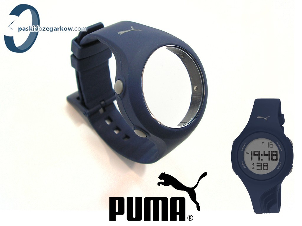 Oryginalny pasek wraz z kopertą, szkłem, przyciskami w kolorze szarym, dekielkiem, śróbkami i uszczelką do zegarka marki PUMA do modelu PU911092009 gumowy, w kolorze granatowym, sprzączka w kolorze czarnym.