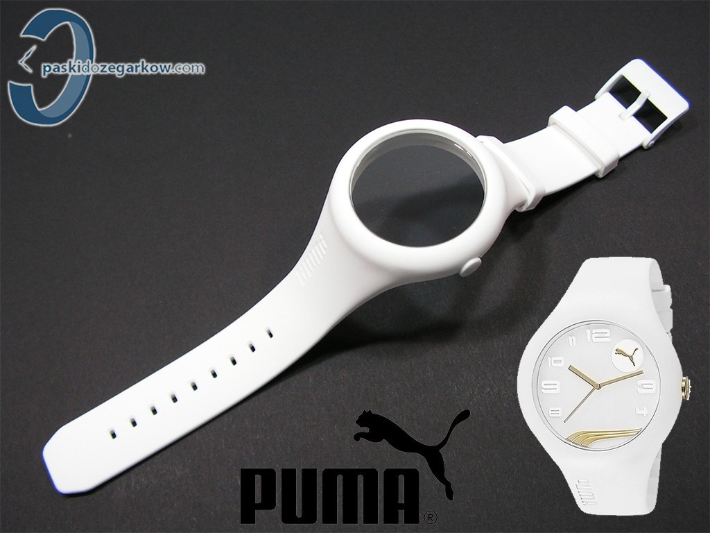 Oryginalny pasek wraz z kopertą, szkłem, dekielkiem, uszczelką i koronką do zegarka marki PUMA PU103682001 w kolorze białym, gumowy.