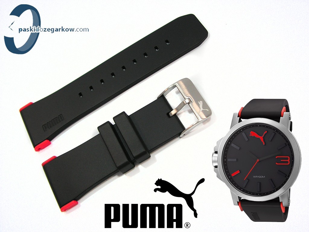 Wyświetl większe Pasek dozegarka PUMA PU102941003 czarny z małą czerwoną wstawką, gumowy, gładki, rozmiar paska 28 mm, pasuje do innych zegarków z rozmiarem koperty 28 mm, zapinany na teleskopy.