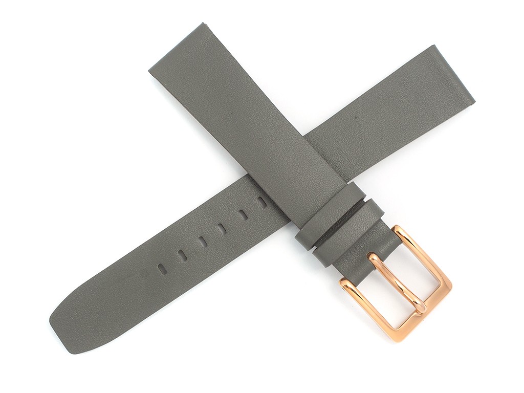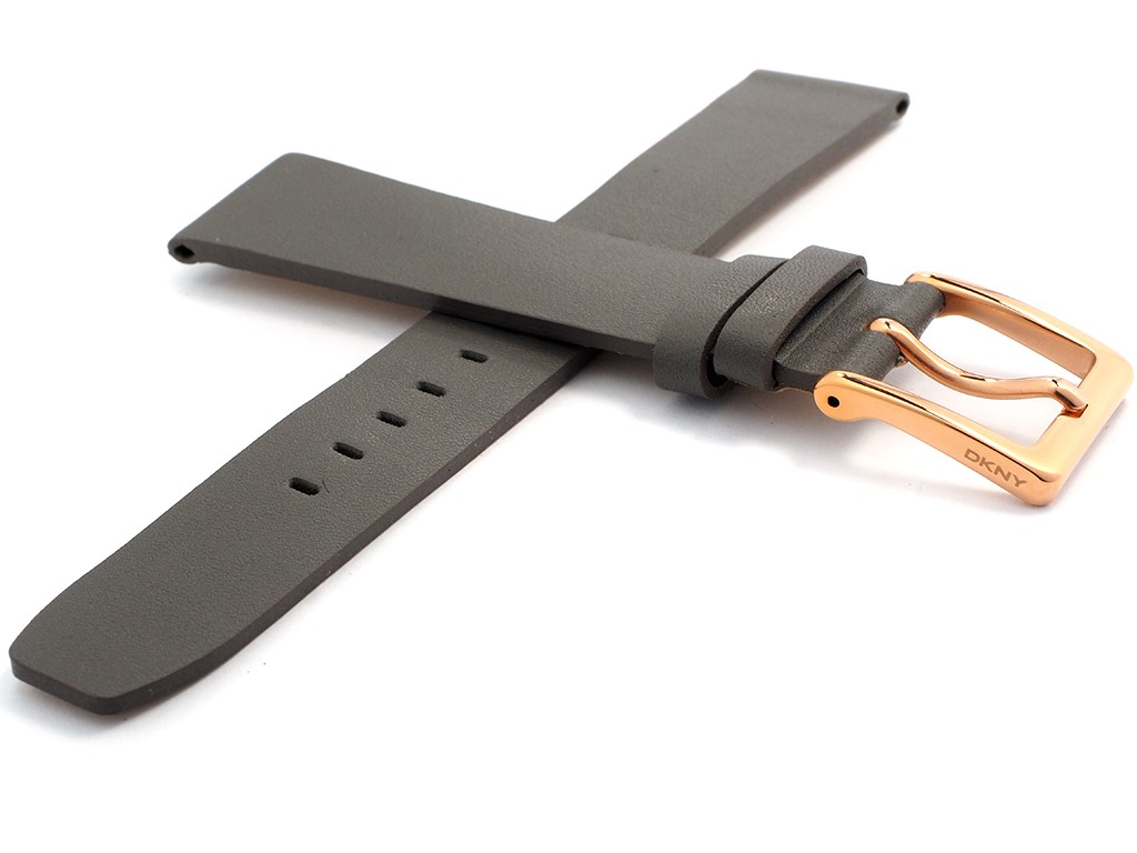 Oryginalny pasek do zegarka marki DKNY do modelu NY2341, wykonany ze skóry naturalnej w kolorze szarym, sprzączka wykonana ze stali nierdzewnej w kolorze różowego złota.