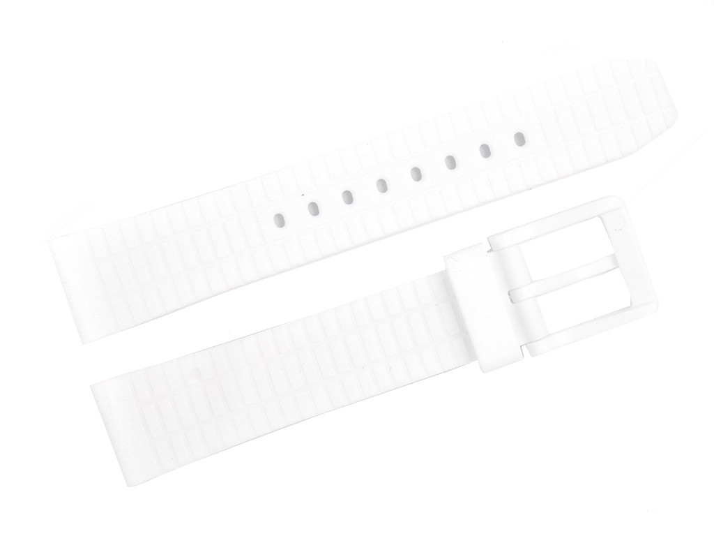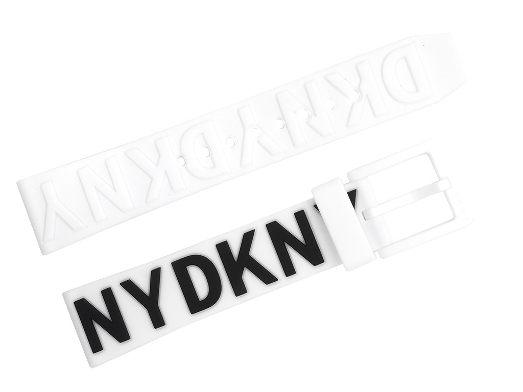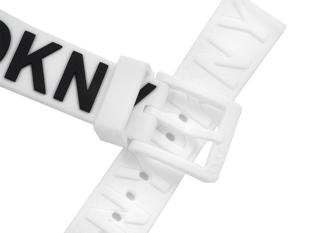 Oryginalny pasek do zegarka marki DKNY do modelu NY2725, wykonany z silikonu w kolorze białym, na pasku tłoczone logo DKNY w kolorze czarnym na jednej części oraz z kolorze białym na drugiej części paska, sprzączka wykonana z tworzywa w kolorze białym.