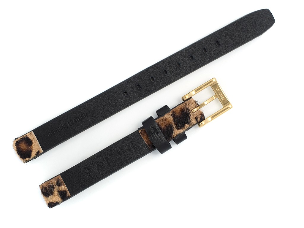 Oryginalny pasek do zegarka marki DKNY do modelu NY2848, wykonany z materiału w kolorze - wzór panterki, od spodu pasek wykonany ze skóry naturalnej w kolorze czarnym, sprzączka wykonana ze stali nierdzewnej w kolorze złotym.