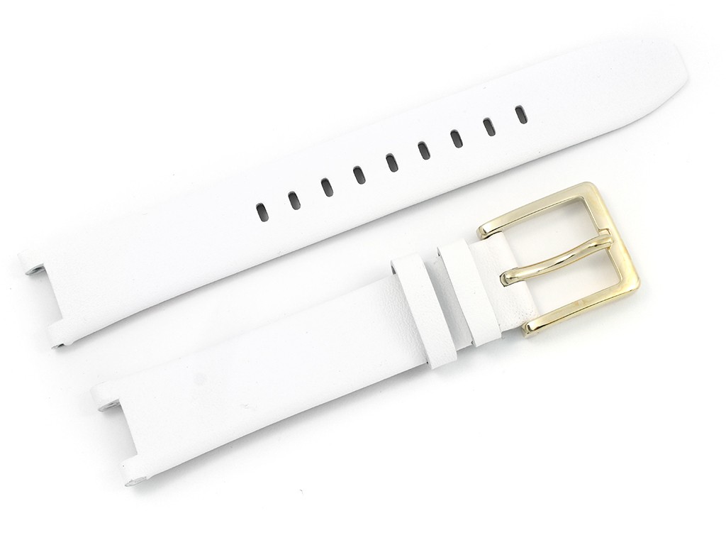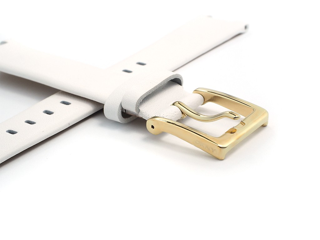 Oryginalny pasek do zegarka marki DKNY do modelu NY2295, wykonany ze skóry naturalnej w kolorze białym, gładki, sprzączka wykonana ze stali nierdzewnej w kolorze złotym.