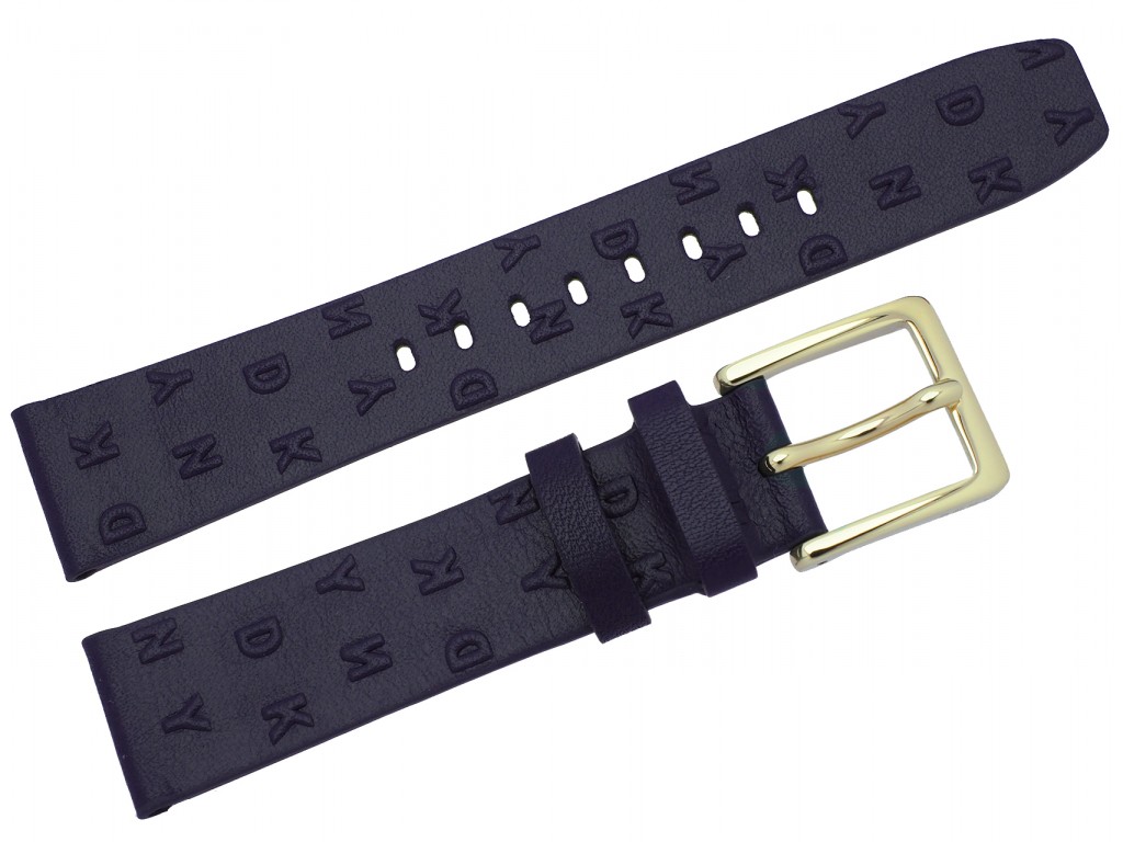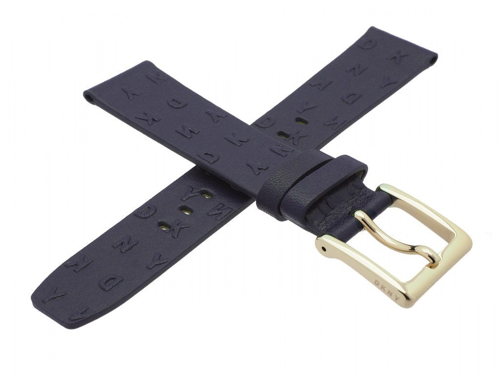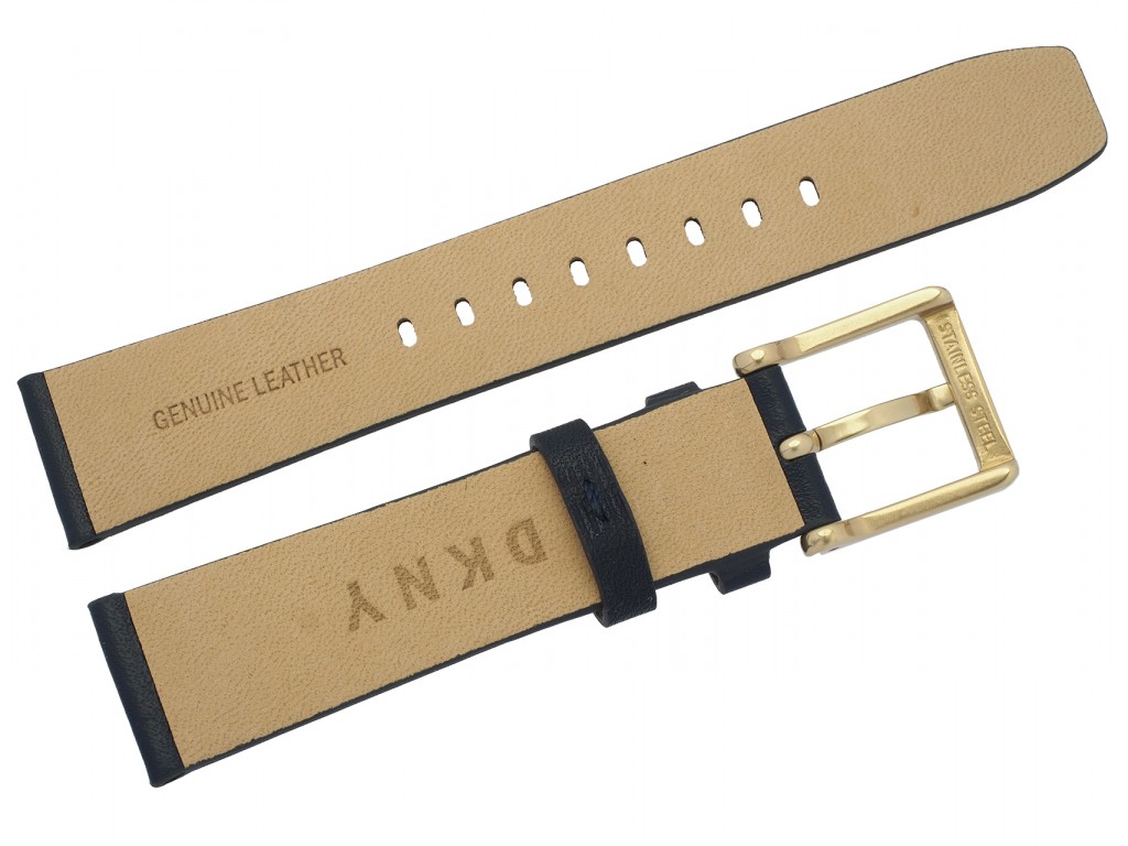 Oryginalny pasek do zegarka marki DKNY do modelu NY2763, wykonany ze skóry naturalnej w kolorze granatowym, sprzączka wykonana ze stali nierdzewnej w kolorze złotym, na pasku tłoczone litery DKNY.