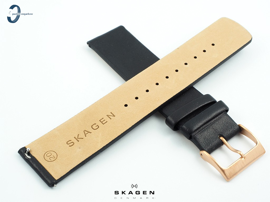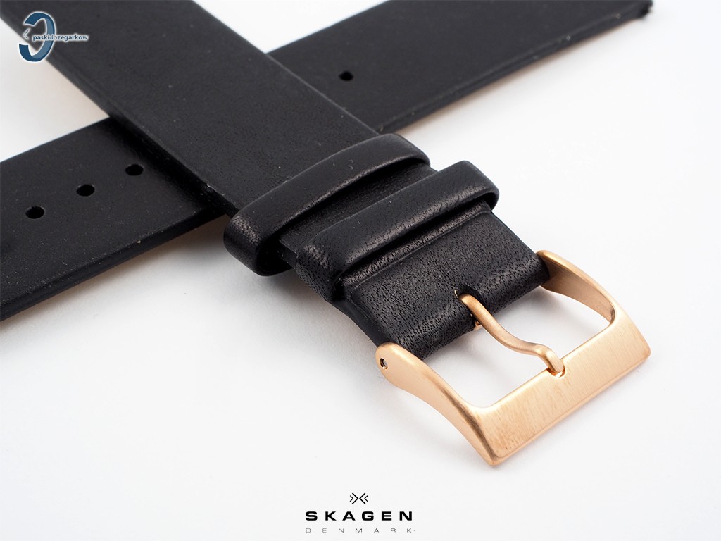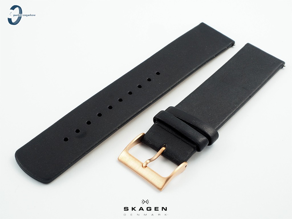 Oryginalny pasek do zegarka Skagen do modelu SKW6371 skórzany, w kolorze czarnym, gładki, bez przeszycia, bez wypełnienia, niezwężany, sprzączka wykonana ze stali nierdzewnej w kolorze różowego złota.