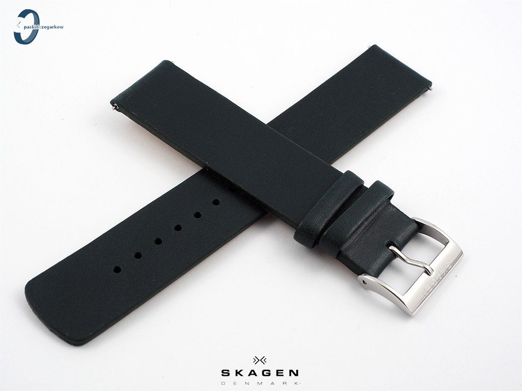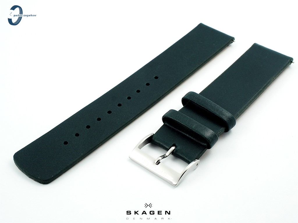 Oryginalny pasek do zegarka Skagen do modelu SKW6466 skórzany, w kolorze ciemnozielonym, gładki, bez przeszycia, bez wypełnienia, niezwężany, sprzączka wykonana ze stali nierdzewnej w kolorze srebrnym.