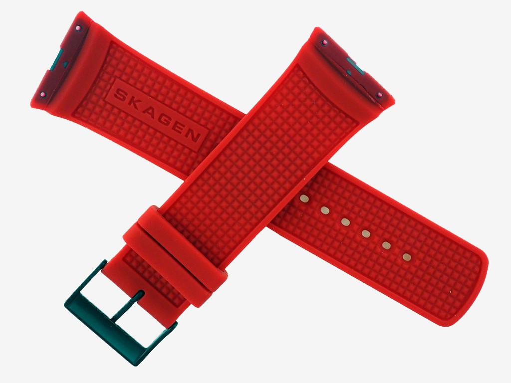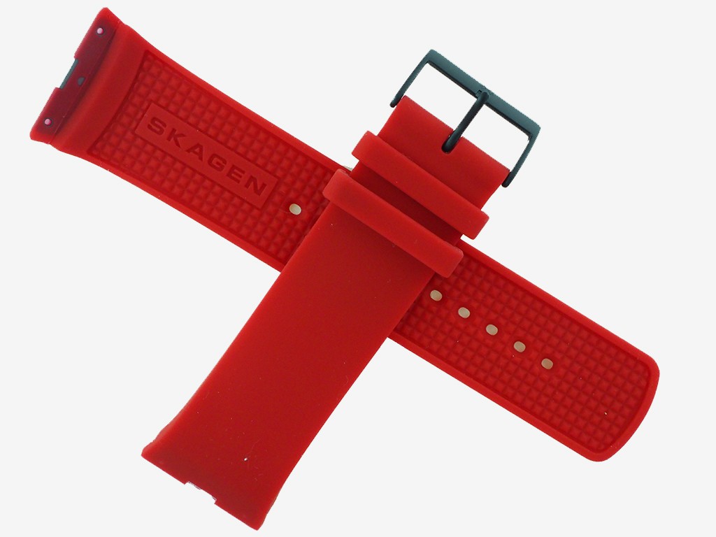 Pasek do zegarka wykonany jest z silikonu w kolorze czerwonym. Sprzączka paska wykonana ze stali nierdzewnej w kolorze czarnym.