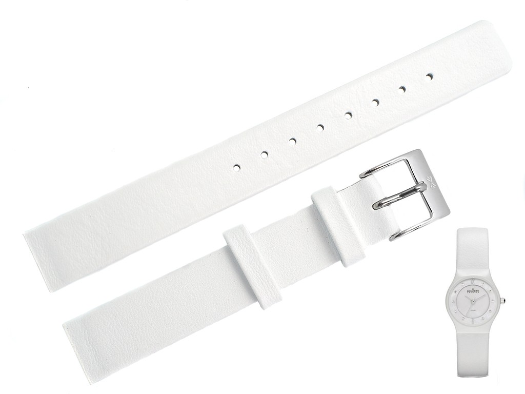 Oryginalny pasek do zegarka marki Skagen do modelu 233XSCLW, wykonany ze skóry naturalnej w kolorze białym, bez przeszycia, gładki, sprzączka wykonana ze stali nierdzewnej w kolorze srebrnym.