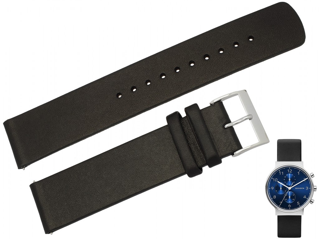 Oryginalny pasek do zegarka marki Skagen do modelu SKW6417 wykonany ze skóry naturalnej w kolorze czarnym, bez przeszycia, gładki, sprzączka wykonana ze stali nierdzewnej w kolorze srebrnym.