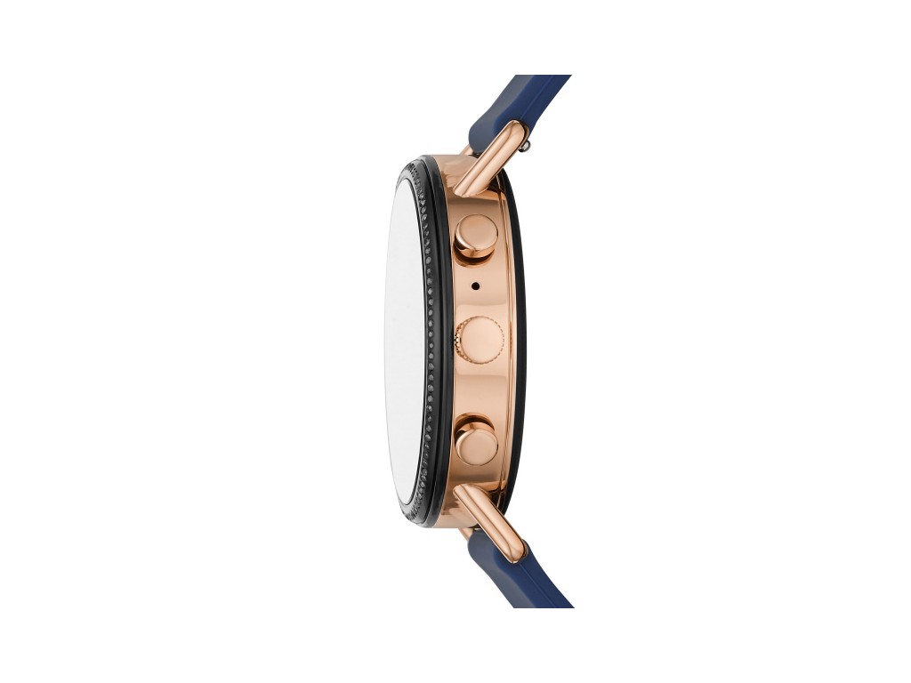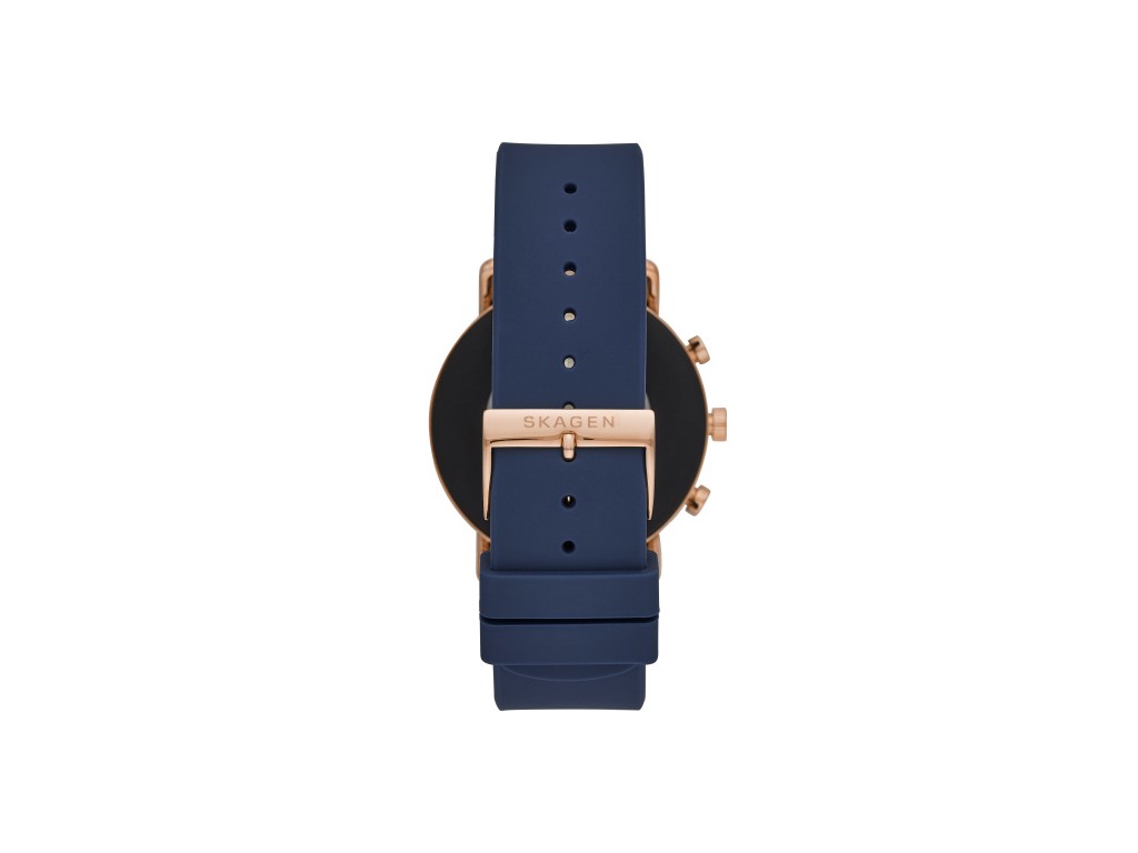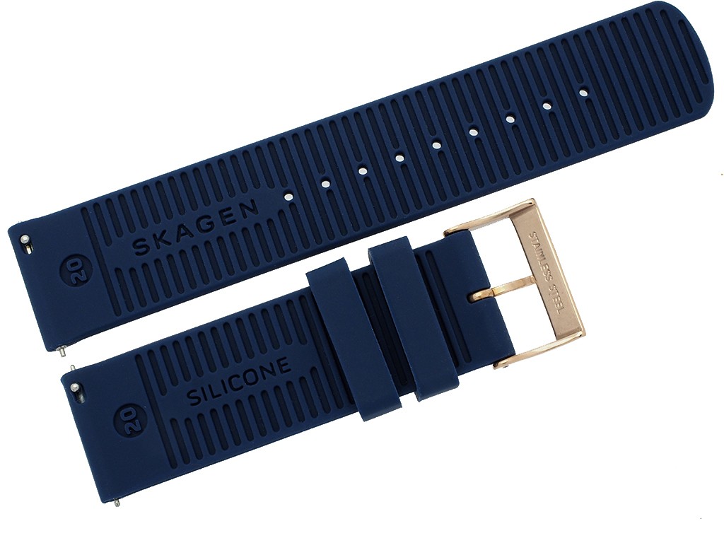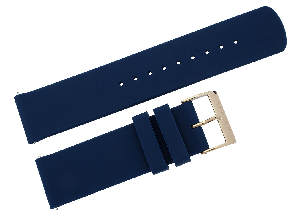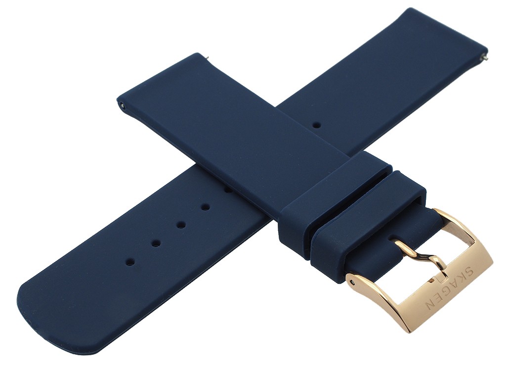Oryginalny pasek do zegarka marki Skagen do modelu SKT5110 silikonowy w kolorze granatowym, gładki, sprzączka wykonana ze stali nierdzewnej w kolorze różowe złoto.