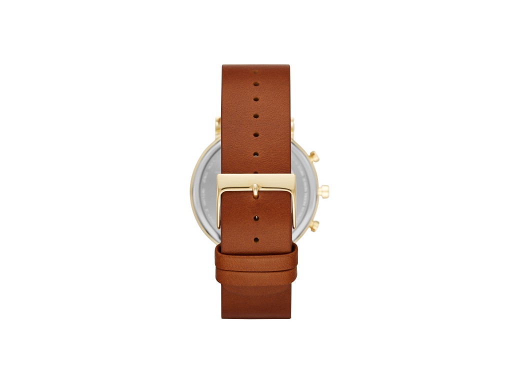 Oryginalny pasek do zegarka marki Skagen do modelu SKT1206 wykonany ze skóry naturalnej w kolorze brązowym, bez przeszycia, gładki, sprzączka wykonana ze stali nierdzewnej w kolorze złitym.