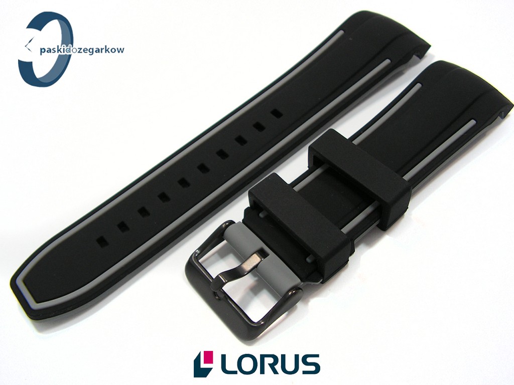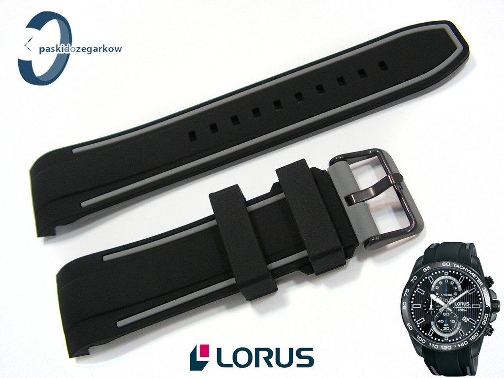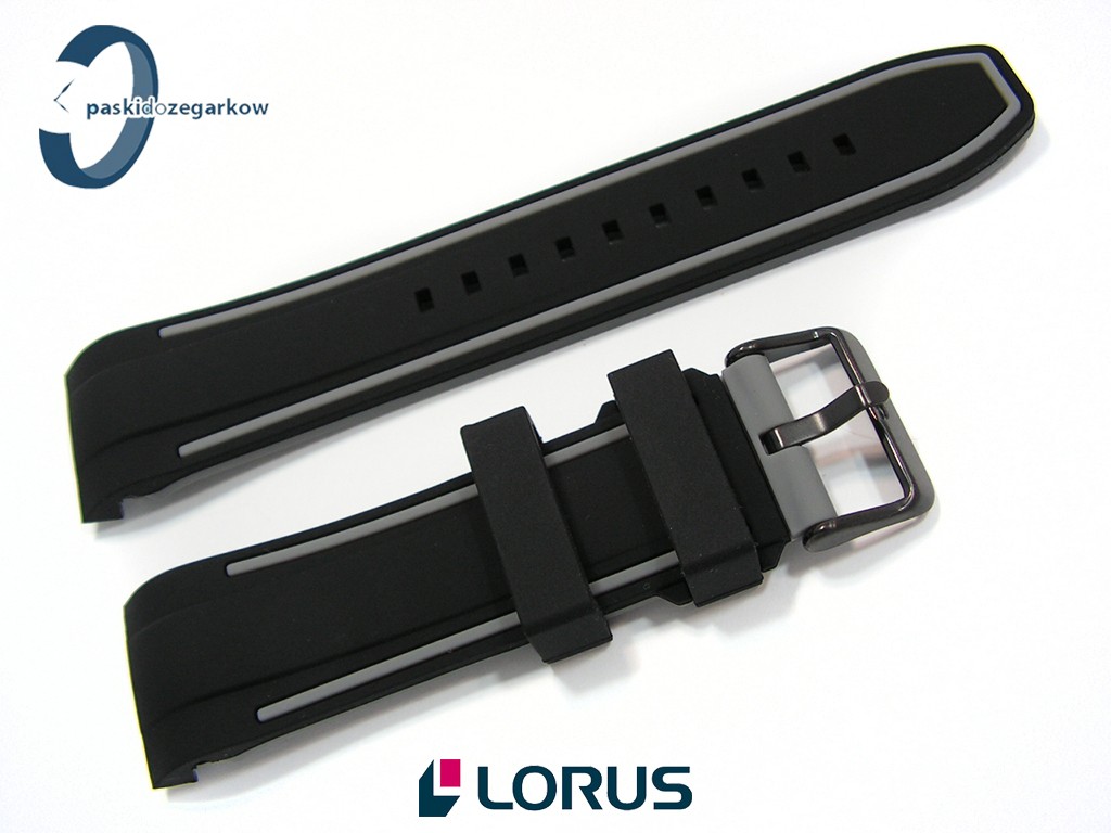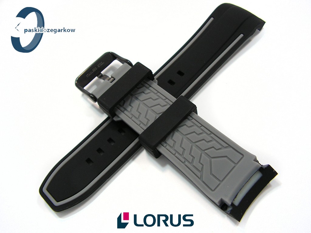 Oryginalny pasek do zegarka marki Lorus do modeli RM385CX9, RM389CX9, RM391DX9, RM353DX9 gumowy w kolorze czarnym z szarą linią, od spodu pasek w kolorze szarym, sprzączka stalowa w kolorze czarnym.