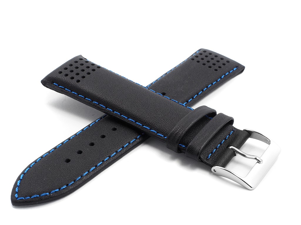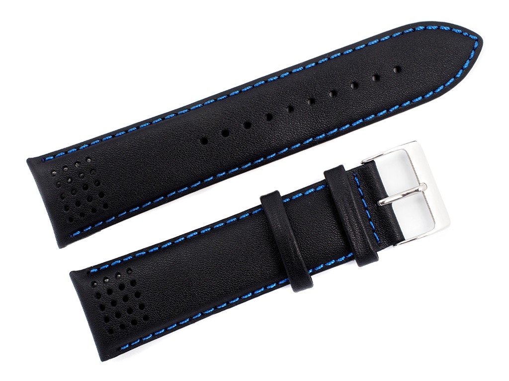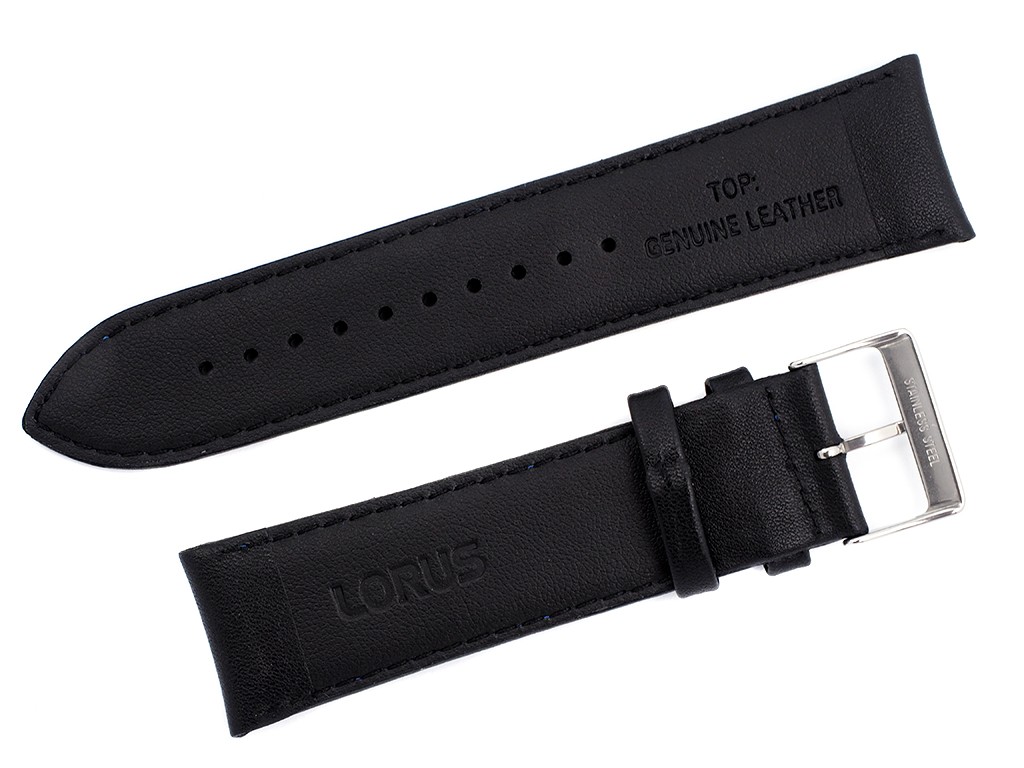 Oryginalny pasek do zegarka od producenta Lorus ( korporacja Seiko) wykonany ze skóry naturalnej w kolorze czarnym, od spodu pasek wykonany ze skóry naturalnej, przeszyty niebieską nicią, sprzączka wykonana ze stali nierdzewnej w kolorze srebrnym połysk.