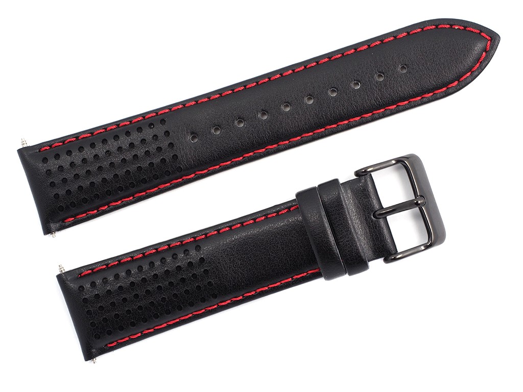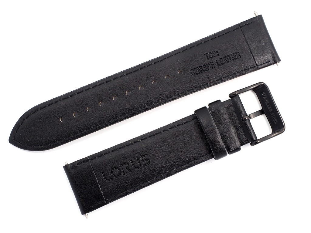 Oryginalny pasek do zegarka od producenta Lorus ( korporacja Seiko) wykonany ze skóry naturalnej w kolorze czarnym, od spodu pasek wykonany ze skóry naturalnej, przeszyty czerwoną nicią, sprzączka wykonana ze stali nierdzewnej w kolorze czarnym.