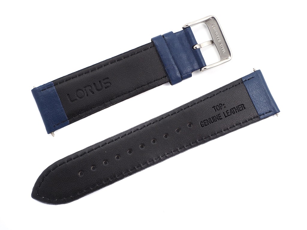 Oryginalny pasek do zegarka od producenta Lorus ( korporacja Seiko) wykonany ze skóry naturalnej w kolorze granatowym, od spodu pasek wykonany ze skóry naturalnej w kolorze czarnym, przeszyty białą nicią, sprzączka wykonana ze stali nierdzewnej w kolorze srebrnym.