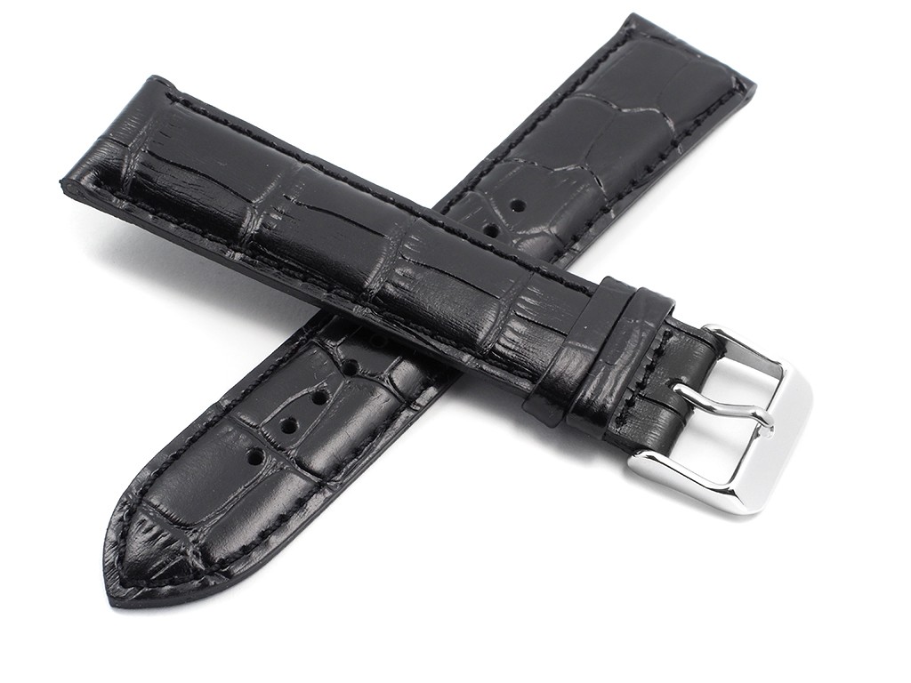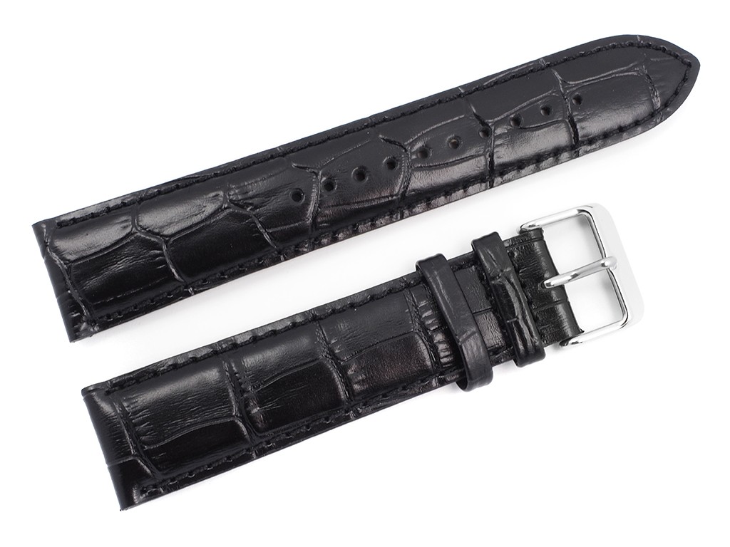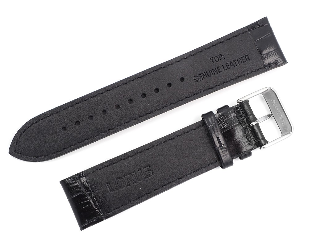 Oryginalny pasek do zegarka od producenta Lorus ( korporacja Seiko) wykonany ze skóry naturalnej w kolorze czarnym, od spodu pasek wykonany ze skóry naturalnej, przeszyty czarną nicią, sprzączka wykonana ze stali nierdzewnej w kolorze srebrnym, na pasku tłoczony wzór aligatora, lekki połysk.