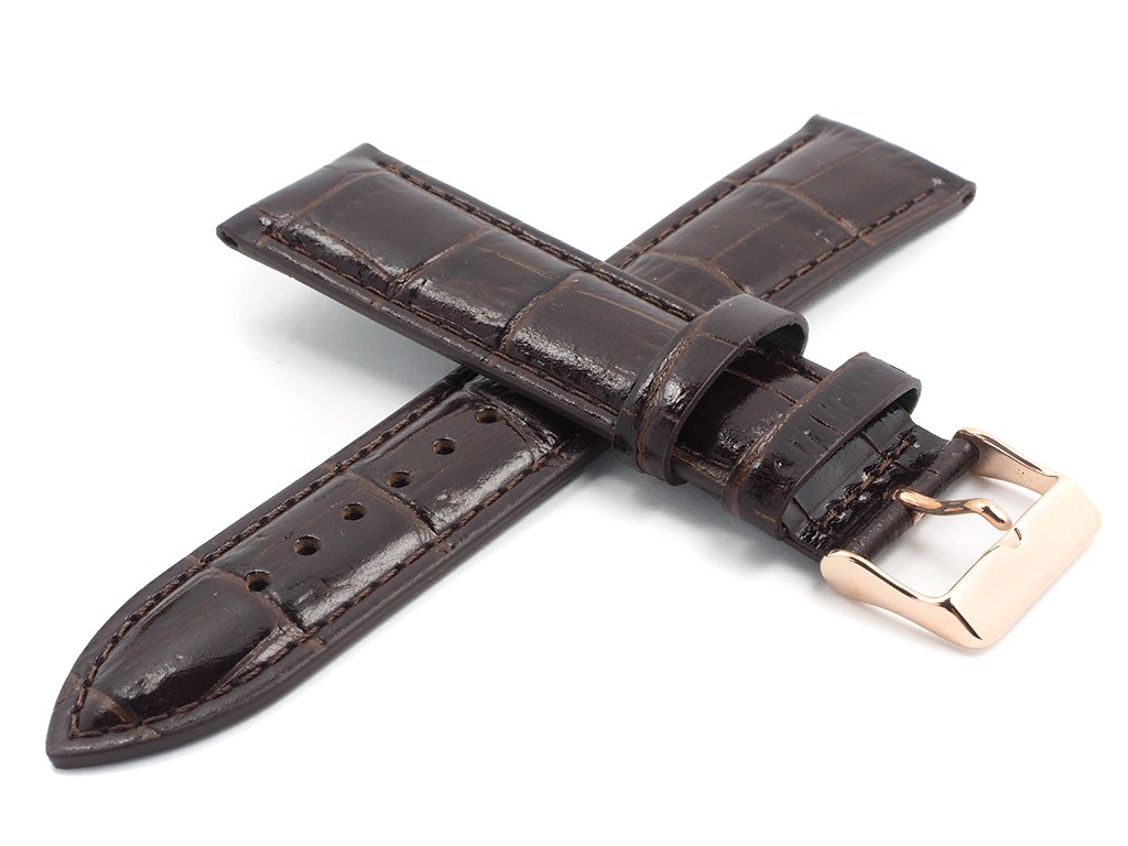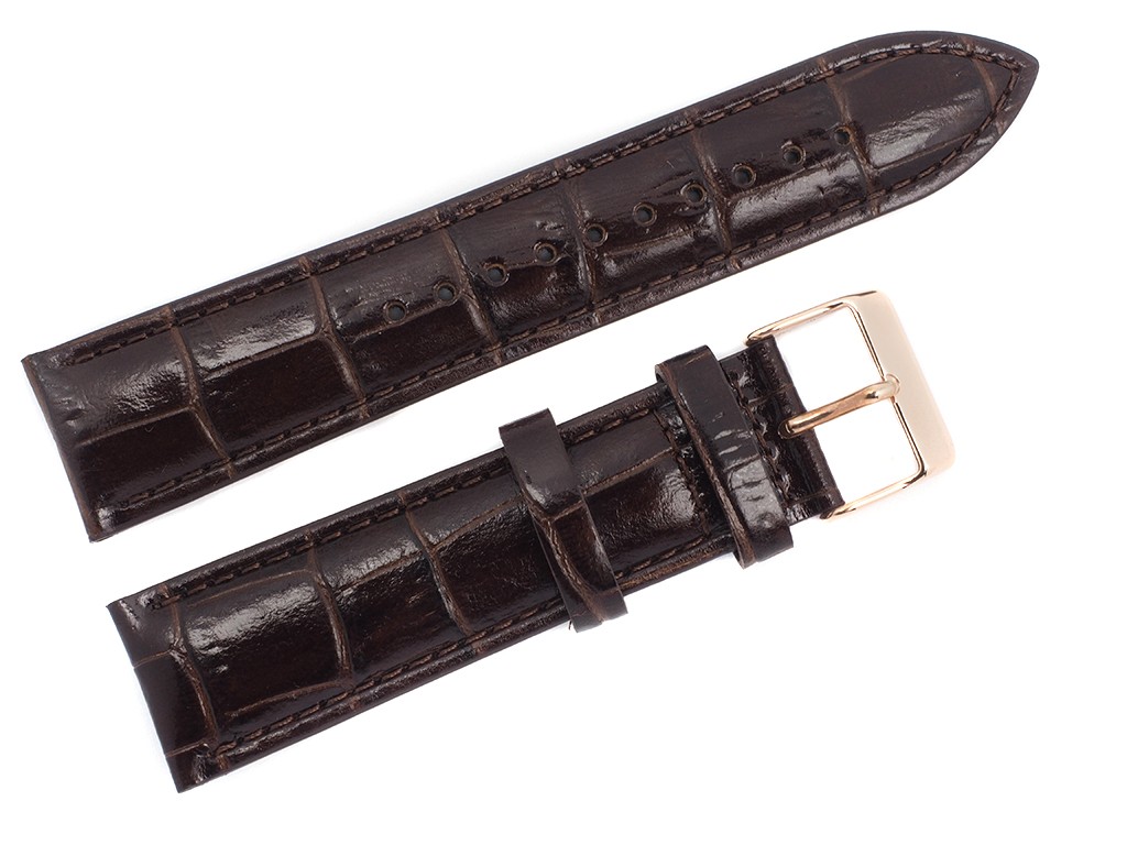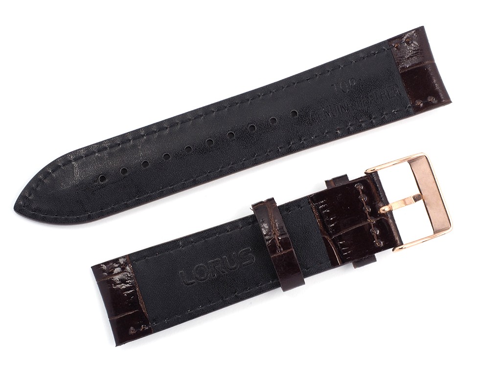 Oryginalny pasek do zegarka od producenta Lorus ( korporacja Seiko) wykonany ze skóry naturalnej w kolorze brązowym, od spodu pasek wykonany ze skóry naturalnej, przeszyty nicią, sprzączka wykonana ze stali nierdzewnej w kolorze różowe złoto, na pasku tłoczony wzór aligatora, lekki połysk.