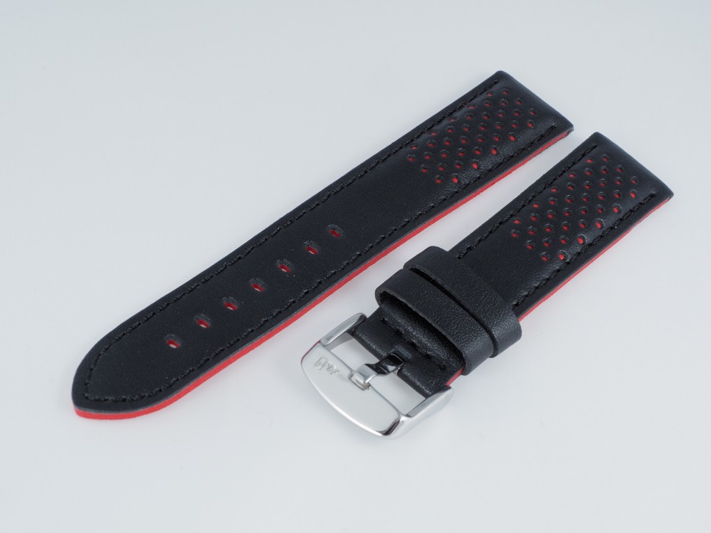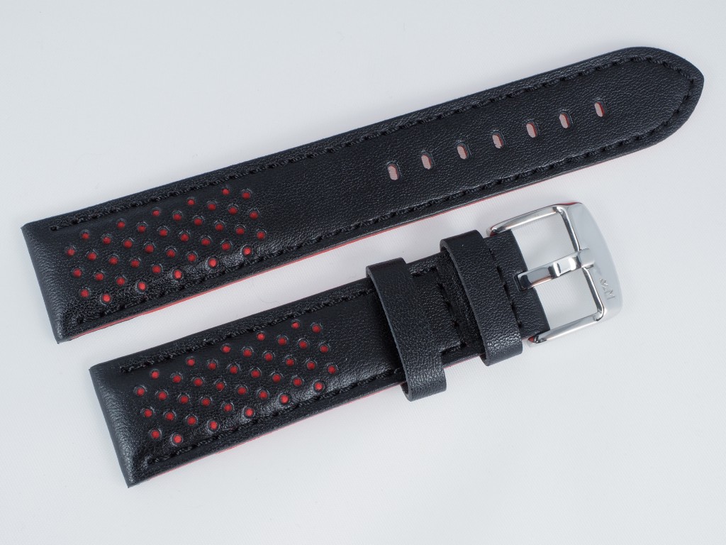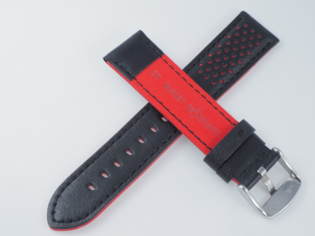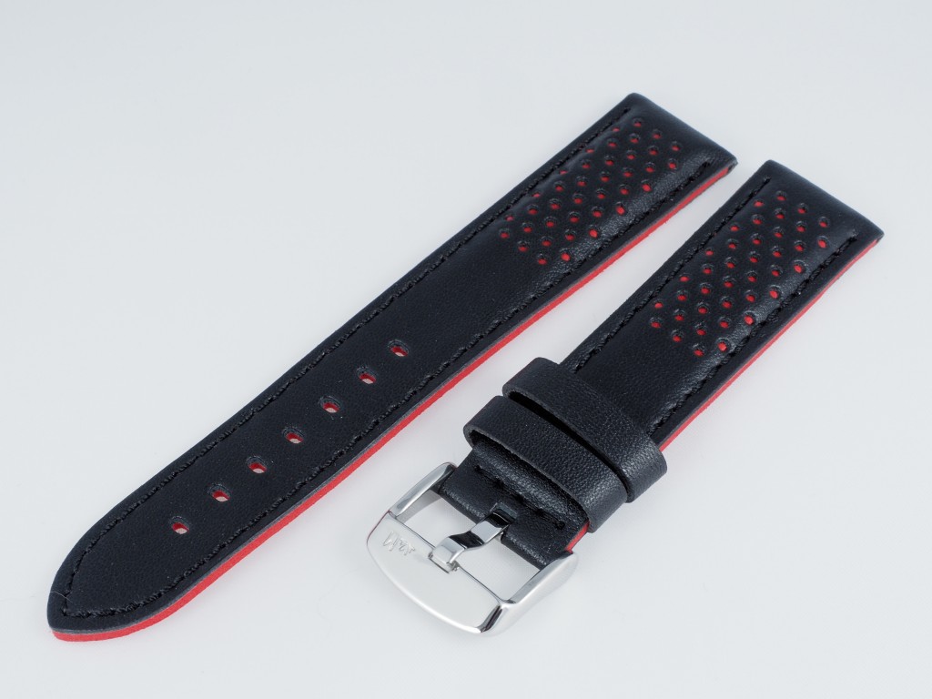 Pasek do zegarka włoskiego producenta Morellato RALLY skórzany w kolorze czarnym i czerwonym. Pasek jest odporny na zamoczenie w wodzie. Sprzączka paska do zegarka wykonana jest ze stali nierdzewnej w kolorze srebrnym.