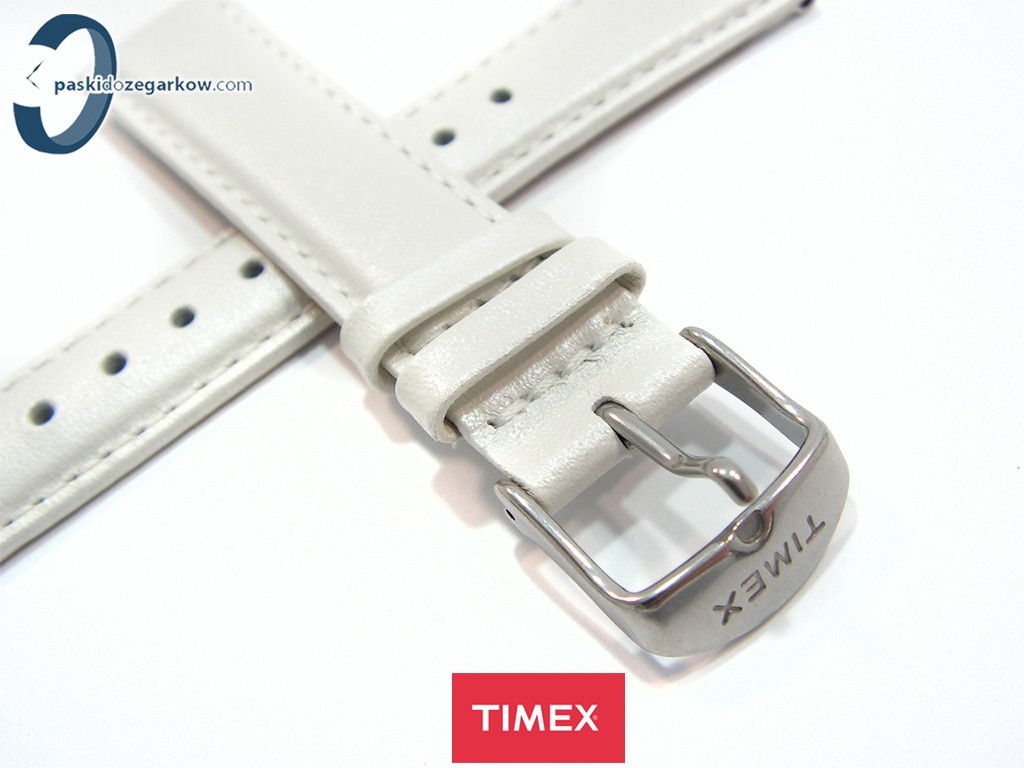 Oryginalany pasek do zegarka marki Timex do modelu T2P164 skórzany, biały perłowy, gładki, przeszyty, sprzączka wykonana ze stali nierdzewnej z napisem Timex, szerokość paska18 mm, pasuje do innych zegarków z rozstawem koperty 18 mm.