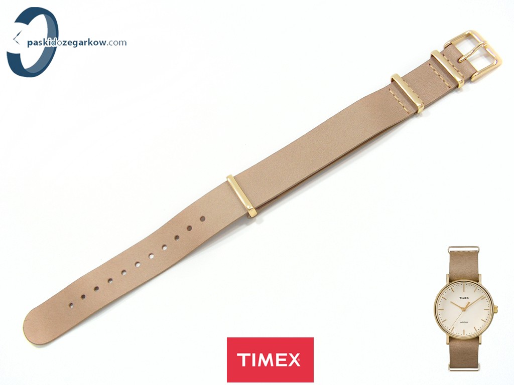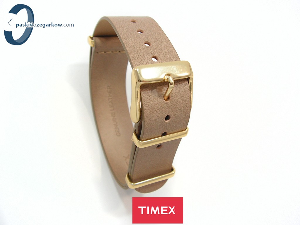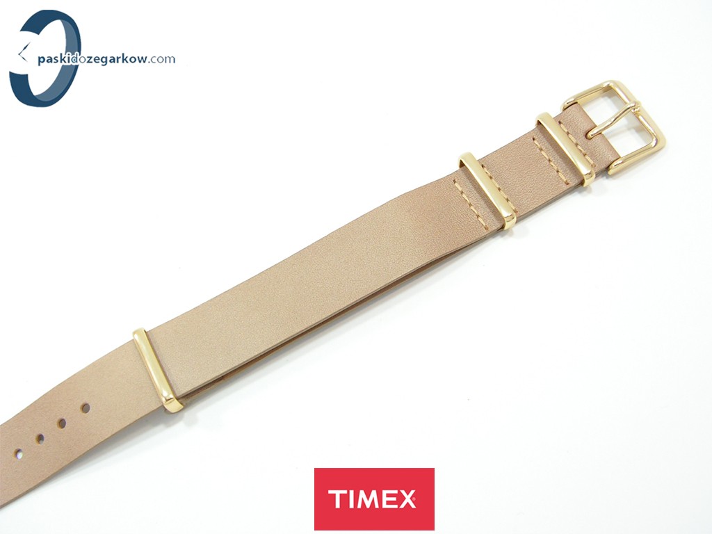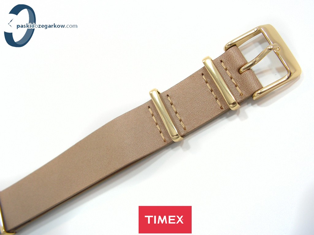 Oryginalny pasek do zegarka marki Timex do modelu TW2P98400 skórzany, jednoczęściowy z podkładką, jasny brąz, gładki, sprzączka oraz szlufki wykonane ze stali nierdzewnej w kolorze złotym, szerokość paska 18 mm, pasuje do innych zegarków z rozstawem koperty 18 mm.