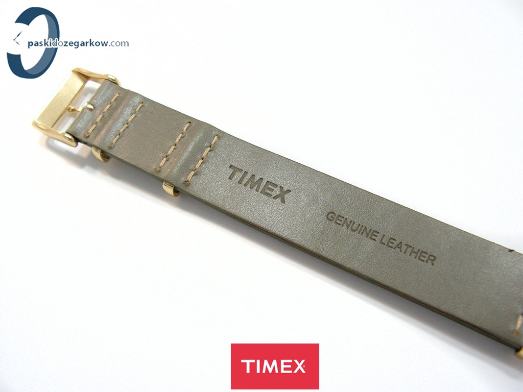 Oryginalny pasek do zegarka marki Timex do modelu TW2P98500 skórzany, jednoczęściowy z podkładką,kolor szary wpadający w zieleń, szerokość paska 18 mm, pasuje do innych zegarków z rozmiarem koperty 18 mm, sprzączka oraz szlufki wykonane ze stali nierdzewnej w kolorze złotym.