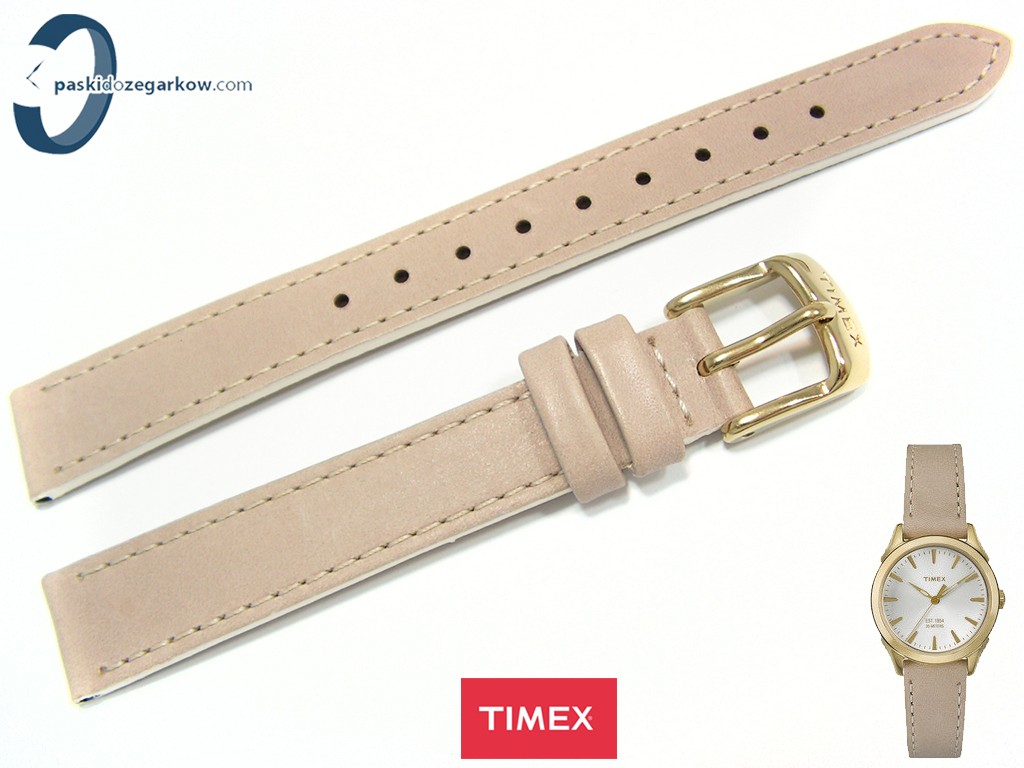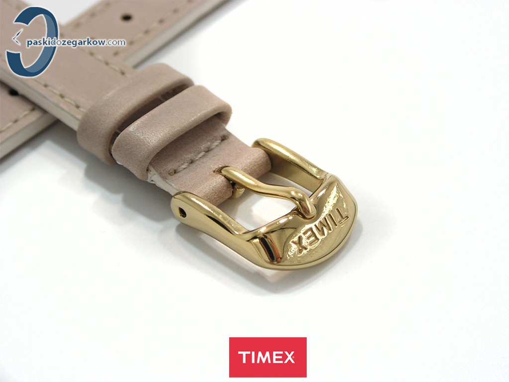 Oryginalny pasek do zegarka Timex do modelu TW2P82000 skórzany w kolorze beżowym, sprzączka wykonana ze stali nierdzewnej w kolorze złotym, na sprzączce napis Timex, gładki, matowy, przeszyty nicią w kolorze paska, szerokość paska 14 mm, pasuje do innych zegarków z rozmiarem koperty 14 mm, zapinany na teleskopy.